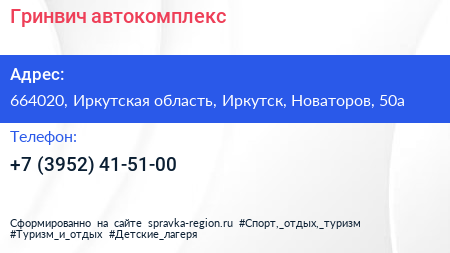 Гринвич, автокомплекс по адресу 664020, Иркутская область, Иркутск, Новаторов, 50а в дальнейшем Организация, размещена в следующих категориях: