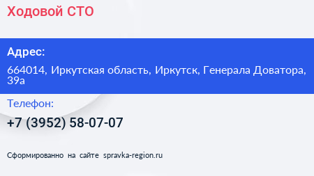 Ходовой, СТО по адресу 664014, Иркутская область, Иркутск, Генерала Доватора, 39а в дальнейшем Организация, размещена в следующих категориях: