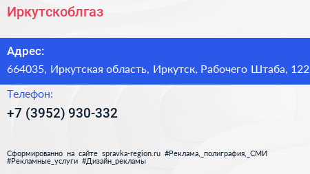 Иркутскоблгаз по адресу 664035, Иркутская область, Иркутск, Рабочего Штаба, 122 в дальнейшем Организация, размещена в следующих категориях: