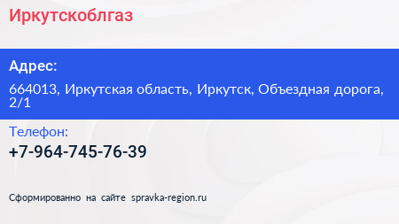 Иркутскоблгаз по адресу 664013, Иркутская область, Иркутск, Объездная дорога, 2/1 в дальнейшем Организация, размещена в следующих категориях:
