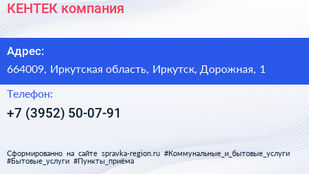 КЕНТЕК, компания по адресу 664009, Иркутская область, Иркутск, Дорожная, 1 в дальнейшем Организация, размещена в следующих категориях: