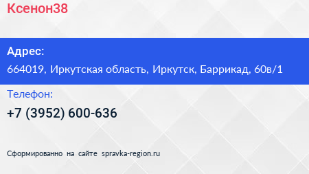 Ксенон38 по адресу 664019, Иркутская область, Иркутск, Баррикад, 60в/1 в дальнейшем Организация, размещена в следующих категориях: