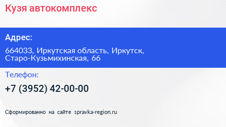 Кузя, автокомплекс по адресу 664033, Иркутская область, Иркутск, Старо-Кузьмихинская, 66 в дальнейшем Организация, размещена в следующих категориях: