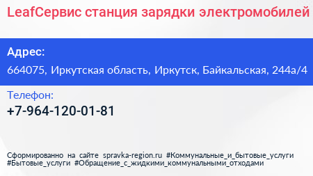 LeafСервис, станция зарядки электромобилей по адресу 664075, Иркутская область, Иркутск, Байкальская, 244а/4 в дальнейшем Организация, размещена в следующих категориях: