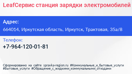 LeafСервис, станция зарядки электромобилей по адресу 664014, Иркутская область, Иркутск, Трактовая, 35а/8 в дальнейшем Организация, размещена в следующих категориях: