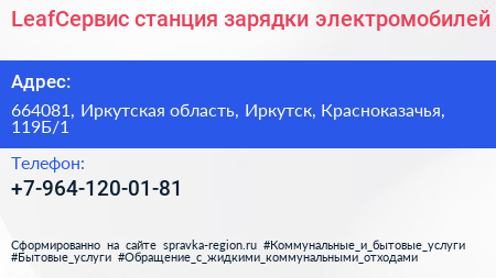LeafСервис, станция зарядки электромобилей по адресу 664081, Иркутская область, Иркутск, Красноказачья, 119Б/1 в дальнейшем Организация, размещена в следующих категориях: