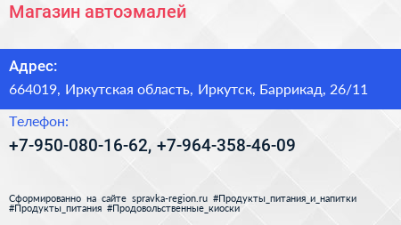 Магазин автоэмалей по адресу 664019, Иркутская область, Иркутск, Баррикад, 26/11 в дальнейшем Организация, размещена в следующих категориях: