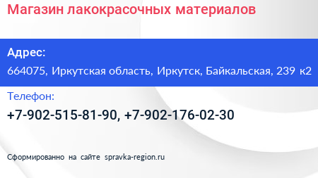 Магазин лакокрасочных материалов по адресу 664075, Иркутская область, Иркутск, Байкальская, 239 к2 в дальнейшем Организация, размещена в следующих категориях: