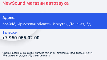 NewSound, магазин автозвука по адресу 664046, Иркутская область, Иркутск, Донская, 5д в дальнейшем Организация, размещена в следующих категориях: