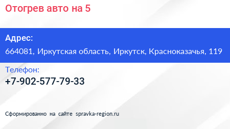 Отогрев авто на 5 по адресу 664081, Иркутская область, Иркутск, Красноказачья, 119 в дальнейшем Организация, размещена в следующих категориях: