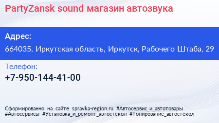 PartyZansk sound, магазин автозвука по адресу 664035, Иркутская область, Иркутск, Рабочего Штаба, 29 в дальнейшем Организация, размещена в следующих категориях: