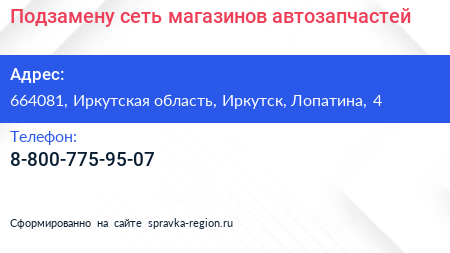 Подзамену, сеть магазинов автозапчастей по адресу 664081, Иркутская область, Иркутск, Лопатина, 4 в дальнейшем Организация, размещена в следующих категориях: