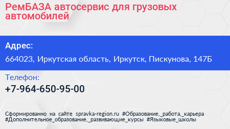 РемБАЗА, автосервис для грузовых автомобилей по адресу 664023, Иркутская область, Иркутск, Пискунова, 147Б в дальнейшем Организация, размещена в следующих категориях: