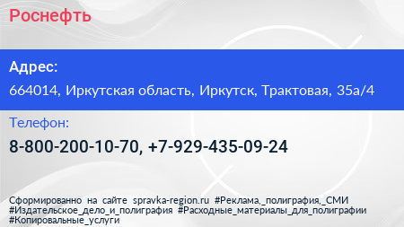 Роснефть по адресу 664014, Иркутская область, Иркутск, Трактовая, 35а/4 в дальнейшем Организация, размещена в следующих категориях: