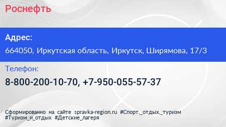 Роснефть по адресу 664050, Иркутская область, Иркутск, Ширямова, 17/3 в дальнейшем Организация, размещена в следующих категориях: