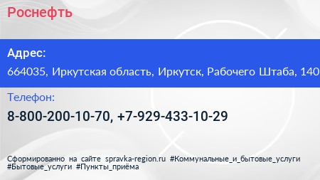 Роснефть по адресу 664035, Иркутская область, Иркутск, Рабочего Штаба, 140 в дальнейшем Организация, размещена в следующих категориях:
