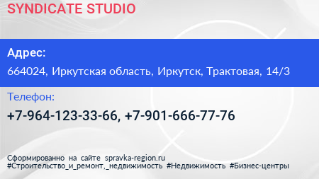 SYNDICATE STUDIO по адресу 664024, Иркутская область, Иркутск, Трактовая, 14/3 в дальнейшем Организация, размещена в следующих категориях: