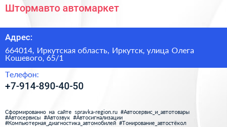 Штормавто, автомаркет по адресу 664014, Иркутская область, Иркутск, улица Олега Кошевого, 65/1 в дальнейшем Организация, размещена в следующих категориях: