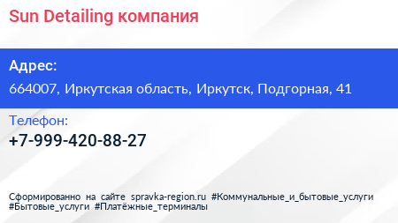 Sun Detailing, компания по адресу 664007, Иркутская область, Иркутск, Подгорная, 41 в дальнейшем Организация, размещена в следующих категориях: