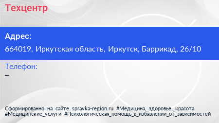 Техцентр по адресу 664019, Иркутская область, Иркутск, Баррикад, 26/10 в дальнейшем Организация, размещена в следующих категориях: