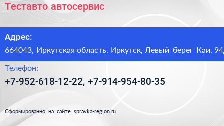 Теставто, автосервис по адресу 664043, Иркутская область, Иркутск, Левый берег Каи, 94д в дальнейшем Организация, размещена в следующих категориях: