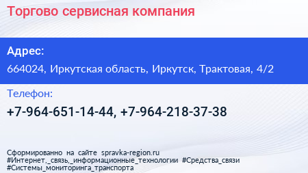 Торгово-сервисная компания по адресу 664024, Иркутская область, Иркутск, Трактовая, 4/2 в дальнейшем Организация, размещена в следующих категориях: