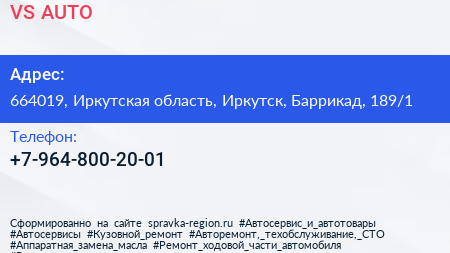 VS AUTO по адресу 664019, Иркутская область, Иркутск, Баррикад, 189/1 в дальнейшем Организация, размещена в следующих категориях: