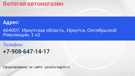 Велегия, автомагазин по адресу 664007, Иркутская область, Иркутск, Октябрьской Революции, 1 к2 в дальнейшем Организация, размещена в следующих категориях: