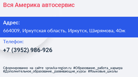 Вся Америка, автосервис по адресу 664009, Иркутская область, Иркутск, Ширямова, 40ж в дальнейшем Организация, размещена в следующих категориях:
