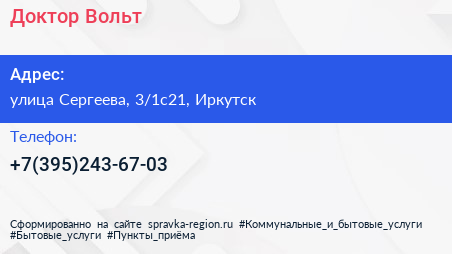 Доктор Вольт по адресу улица Сергеева, 3/1с21, Иркутск в дальнейшем Организация, размещена в следующих категориях:
