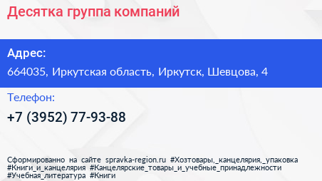 Десятка, группа компаний по адресу 664035, Иркутская область, Иркутск, Шевцова, 4 в дальнейшем Организация, размещена в следующих категориях: