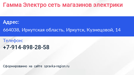 Гамма Электро, сеть магазинов электрики по адресу 664038, Иркутская область, Иркутск, Кузнецовой, 14 в дальнейшем Организация, размещена в следующих категориях: