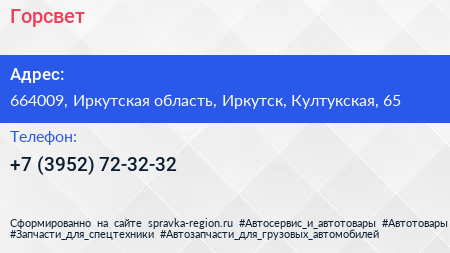 Горсвет по адресу 664009, Иркутская область, Иркутск, Култукская, 65 в дальнейшем Организация, размещена в следующих категориях: