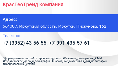 КрасГеоТрейд, компания по адресу 664009, Иркутская область, Иркутск, Пискунова, 162 в дальнейшем Организация, размещена в следующих категориях: