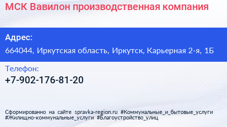 МСК Вавилон, производственная компания по адресу 664044, Иркутская область, Иркутск, Карьерная 2-я, 1Б в дальнейшем Организация, размещена в следующих категориях: