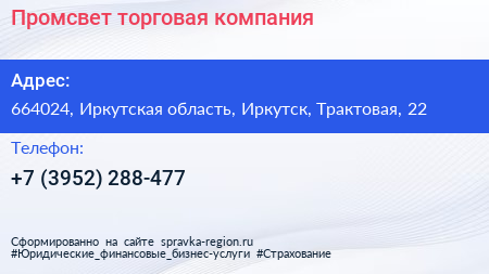 Промсвет, торговая компания по адресу 664024, Иркутская область, Иркутск, Трактовая, 22 в дальнейшем Организация, размещена в следующих категориях: