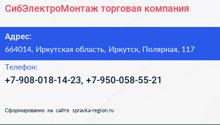 СибЭлектроМонтаж, торговая компания по адресу 664014, Иркутская область, Иркутск, Полярная, 117 в дальнейшем Организация, размещена в следующих категориях: