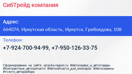 СибТрейд, компания по адресу 664074, Иркутская область, Иркутск, Грибоедова, 108 в дальнейшем Организация, размещена в следующих категориях: