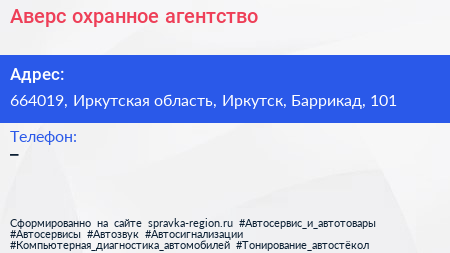 Аверс, охранное агентство по адресу 664019, Иркутская область, Иркутск, Баррикад, 101 в дальнейшем Организация, размещена в следующих категориях: