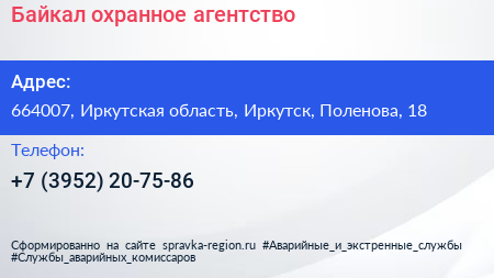 Байкал, охранное агентство по адресу 664007, Иркутская область, Иркутск, Поленова, 18 в дальнейшем Организация, размещена в следующих категориях: