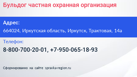 Бульдог, частная охранная организация по адресу 664024, Иркутская область, Иркутск, Трактовая, 14а в дальнейшем Организация, размещена в следующих категориях: