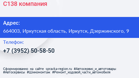 C138, компания по адресу 664003, Иркутская область, Иркутск, Дзержинского, 9 в дальнейшем Организация, размещена в следующих категориях:
