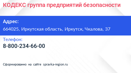 КОДЕКС, группа предприятий безопасности по адресу 664025, Иркутская область, Иркутск, Чкалова, 37 в дальнейшем Организация, размещена в следующих категориях: