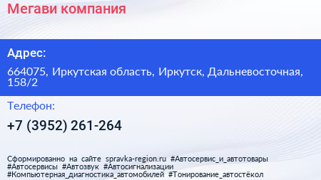 Мегави, компания по адресу 664075, Иркутская область, Иркутск, Дальневосточная, 158/2 в дальнейшем Организация, размещена в следующих категориях: