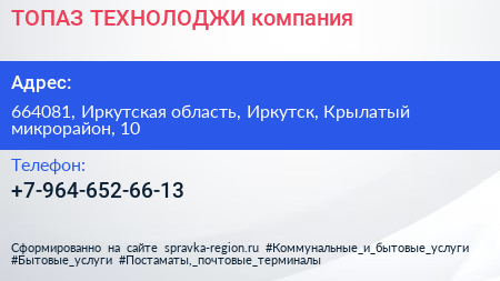 ТОПАЗ-ТЕХНОЛОДЖИ, компания по адресу 664081, Иркутская область, Иркутск, Крылатый микрорайон, 10 в дальнейшем Организация, размещена в следующих категориях:
