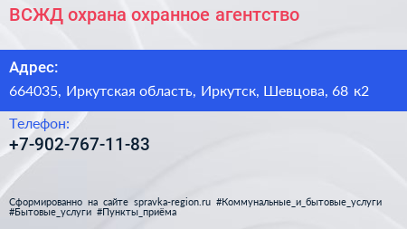 ВСЖД охрана, охранное агентство по адресу 664035, Иркутская область, Иркутск, Шевцова, 68 к2 в дальнейшем Организация, размещена в следующих категориях: