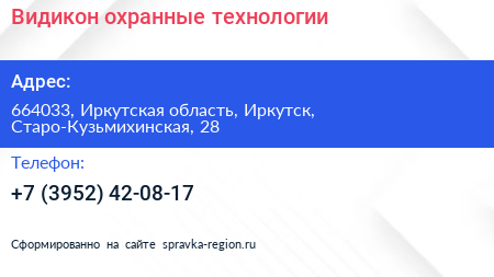 Видикон-охранные технологии по адресу 664033, Иркутская область, Иркутск, Старо-Кузьмихинская, 28 в дальнейшем Организация, размещена в следующих категориях: