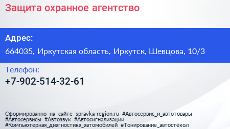 Защита, охранное агентство по адресу 664035, Иркутская область, Иркутск, Шевцова, 10/3 в дальнейшем Организация, размещена в следующих категориях: