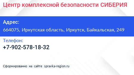 Центр комплексной безопасности СИБЕРИЯ по адресу 664075, Иркутская область, Иркутск, Байкальская, 249 в дальнейшем Организация, размещена в следующих категориях:
