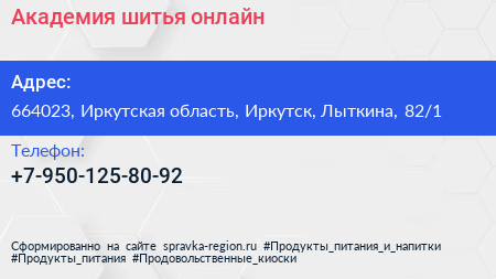 Академия шитья онлайн по адресу 664023, Иркутская область, Иркутск, Лыткина, 82/1 в дальнейшем Организация, размещена в следующих категориях: